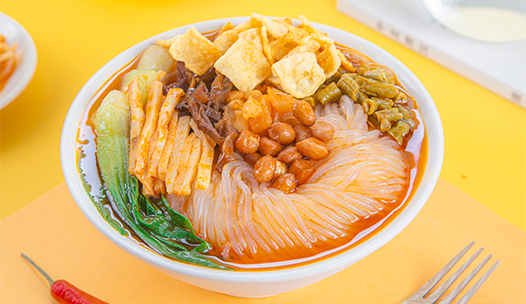 初聞說怪,捂鼻入口立覺驚艷;爽滑Q彈的魔芋螺螄粉,吸收了濃郁湯底,散發著令人著迷的酸爽香氣,口感勁道爽彈,軟糯適中,酸不激齒,辣而不燥,嗦出酣暢淋漓。